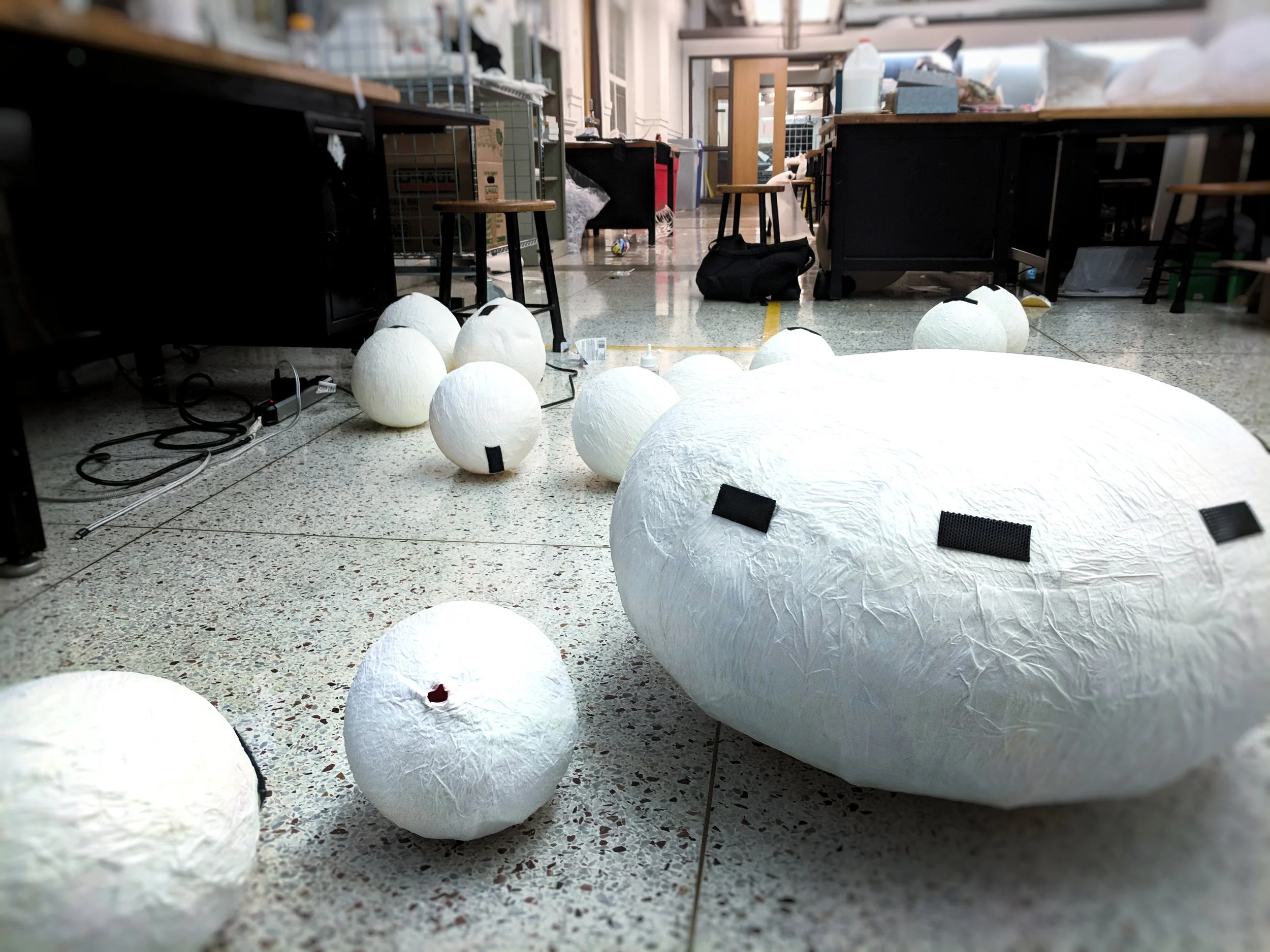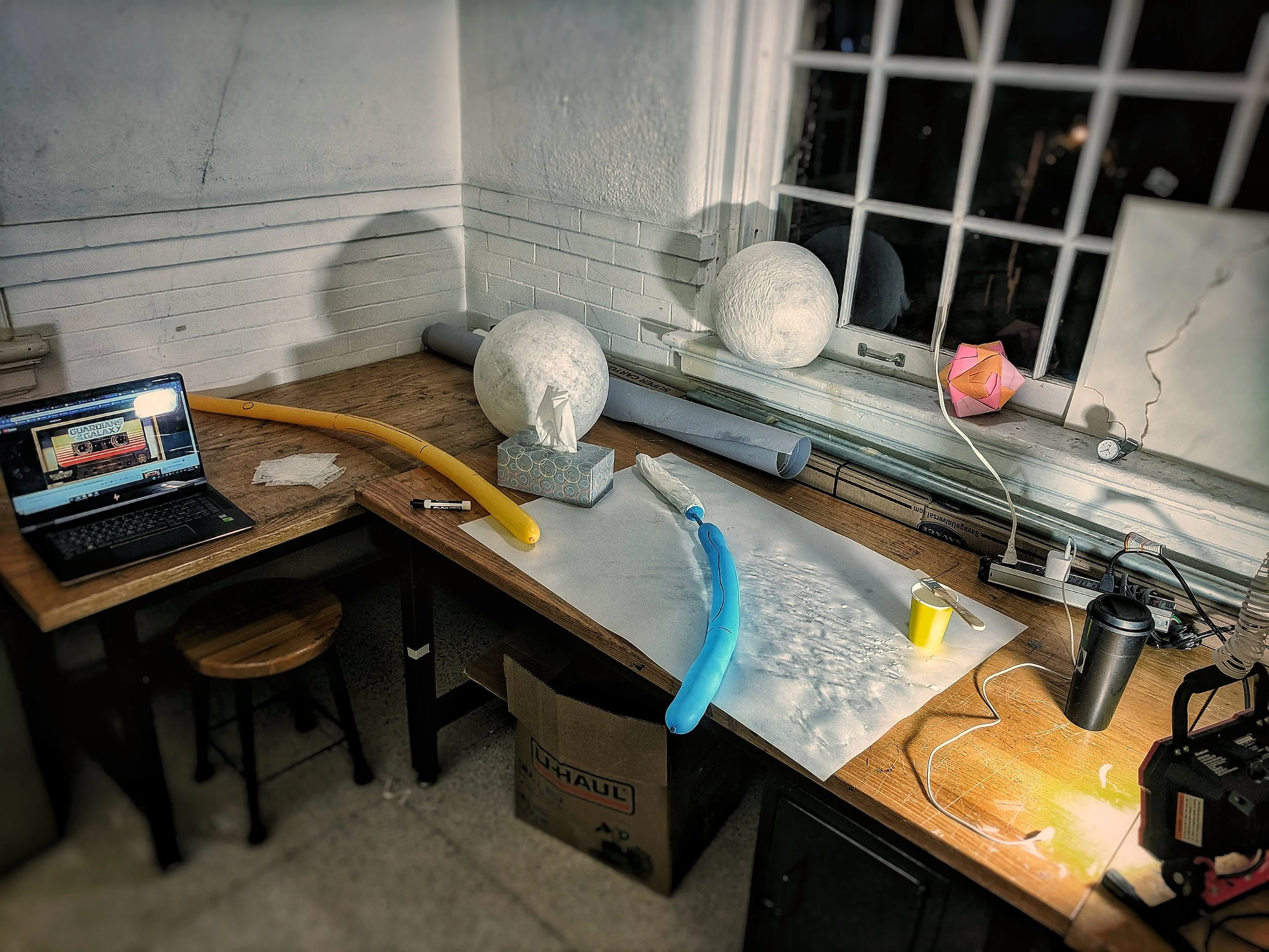 Initially, the concept was going to take on a sinister undertone. As I experimented with concepts, materials and construction methods, it was clear that a playful element was more impactful. I took inspiration from balloon animals, elephants and squids. Concepts grew from hand-sized to larger and larger hands until I landed on this. I papier mached balloons from Party City, with the largest balloon they sold as the palm. Then, Velcro was super glued at the joints to hold it all together.